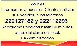 Aviso: Se recibirán pedidos hasta 30 minutos antes del cierre del local.